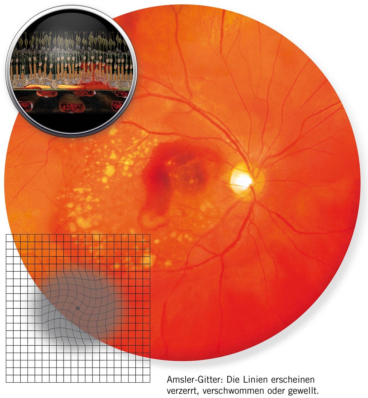Bei der AMD (altersbedingte Makuladegeneration) sind die Sehfunktionen Sehschärfe (Auflösung, Kontrastsehen) und das Farbensehen beeinträchtigt. Es kann zu einem wellenlinienartigen Verzerrtsehen kommen.
